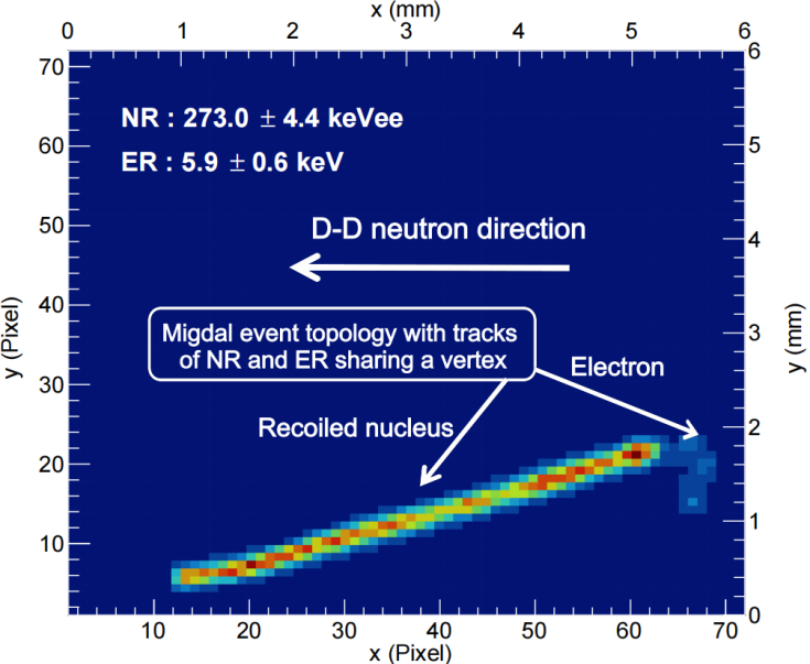 研究团队自主研发了微结构气体探测器和像素读出芯片组合的超灵敏探测装置,相当于可拍摄单原子运动中释放电子过程的照相机。利用紧凑型氘-氘聚变反应加速器中子源轰击装置内的气体分子,会产生原子核反冲与米格达尔电子,二者形成共顶点的独特轨迹。团队成功地将Migdal事例从伽马射线、宇宙射线等背景干扰中区分开来,首次直接证实了理论预言的Migdal效应。