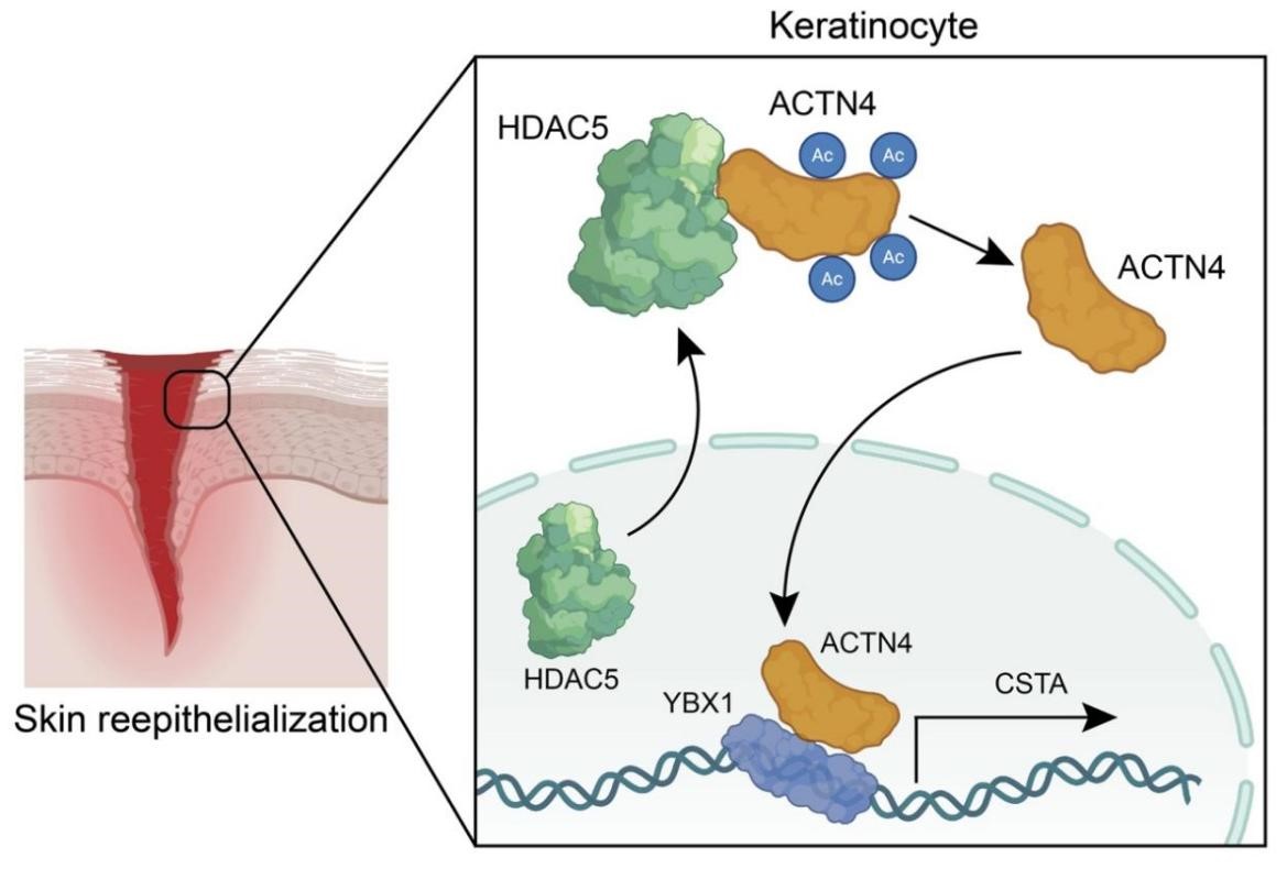 该研究阐明了HDAC5促进慢性创面再上皮化的关键分子机制,筛选获得了HDAC5选择性激活剂并证实了其促愈合效果,为慢性创面治疗提供了新的思路。