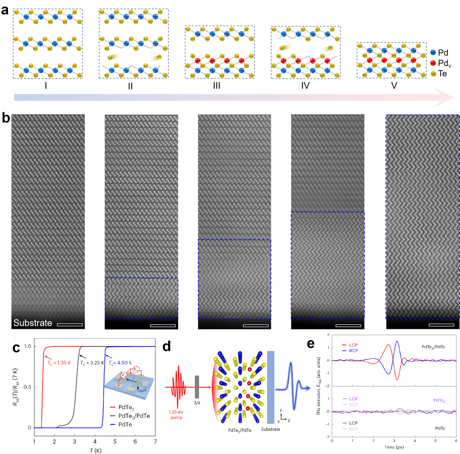 图 (a) 热驱动PdTe2向PdTe相变的原子结构演化示意图;(b) 动态截面STEM图,比例尺:2 nm;(c) 不同Pd-Te相薄膜的超导性能;(d) 太赫兹时域光谱测量示意图;(e) 太赫兹波发射性能对比