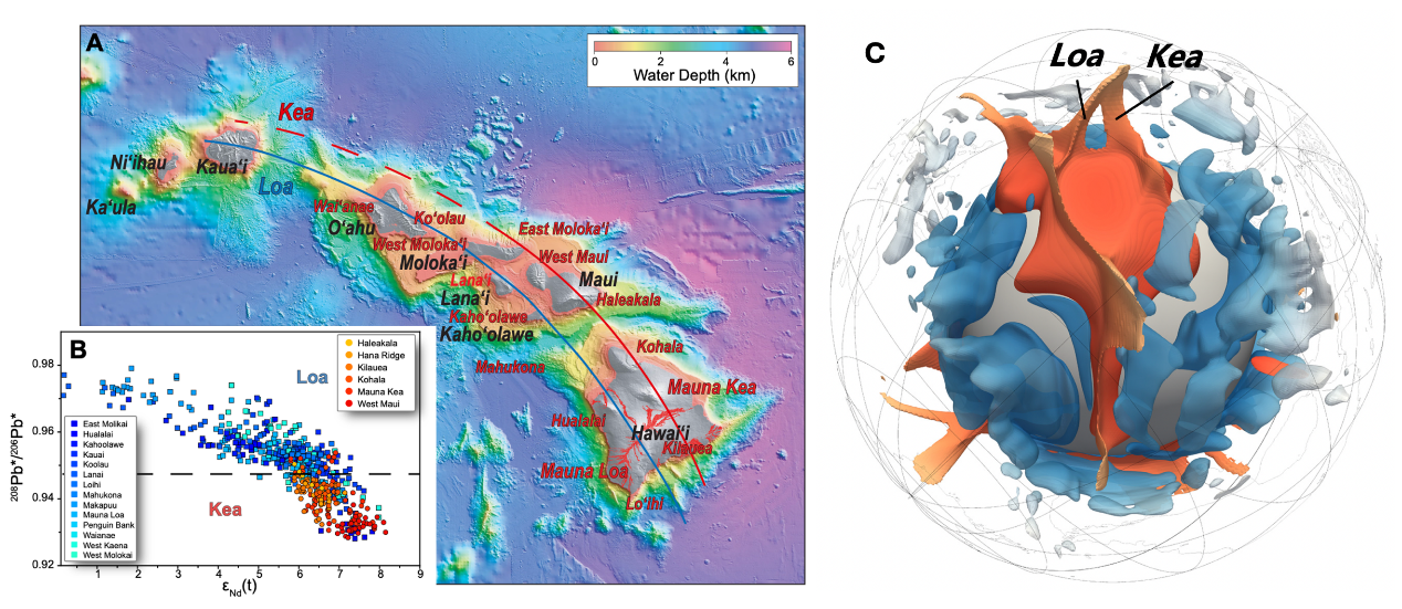 有别于经典地幔柱理论预测的单火山岛链,太平洋上多个热点火山呈现出双岛链趋势,且两条子岛链的岩浆岩地球化学特征差异显著。其中最著名的例子是夏威夷群岛,其在过去数百万年间形成了Loa和Kea两个子岛链:“Loa型”岩浆同位素更富集,主要分布在火山链的西南一侧;“Kea型”岩浆相对亏损,主要出露于火山链的东北一侧(图A,B)。已有研究从地幔柱与板块相互作用、以及地幔柱内部化学分异等角度提出了多个模型,但普遍无法在时间和空间上同时解释夏威夷岛链的演化特征。