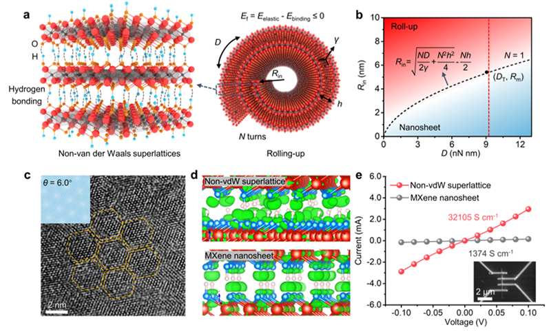 图 非范德华超晶格的晶体结构与电学性质。(a)非范德华超晶格结构示意图;(b)非范德华超晶格形成机制图;(c)非范德华超晶格原子结构图;(d)非范德华超晶格电子结构示意图;(e)非范德华超晶格电学测试结果