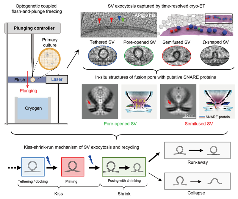 基于对上千套高分辨率突触三维结构数据的系统分析,研究团队绘制出突触囊泡释放与快速回收的完整过程,并提出全新理论模型-亲吻-收缩-逃逸/融合:在动作电位触发后4 毫秒内,囊泡首先与突触前膜融合形成约4纳米的融合孔(“亲吻”,kiss);随后收缩为表面积减半的小囊泡(“收缩”,shrink);最后,大部分小囊泡在70毫秒内开始以“逃逸”(Run)方式回收,少部分则与突触前膜 “全融合”(Collapse)。