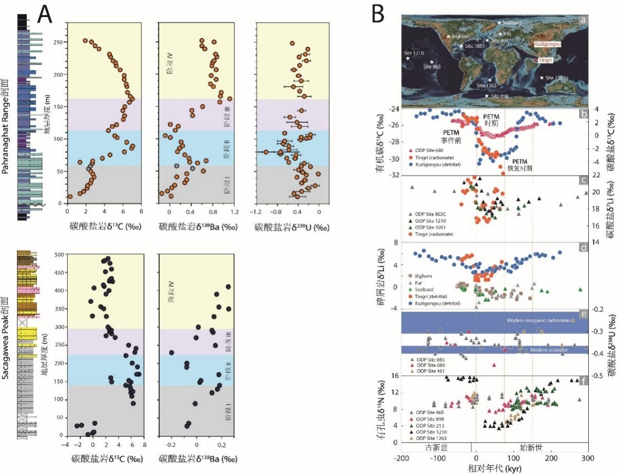 图 (A)晚古生代石炭纪早期海相碳酸盐碳、钡和铀同位素组成;(B)古新世-始新世极热事件前后海相碳酸盐和碎屑岩碳、锂、铀同位素及有孔虫氮同位素组成