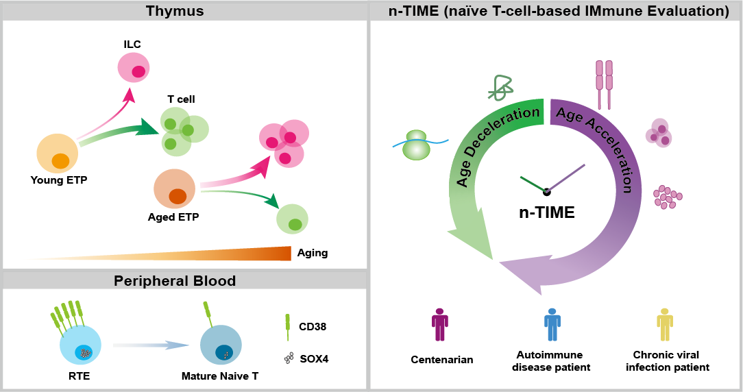研究团队综合利用单细胞转录组测序、单细胞T细胞受体测序和CITE-seq等技术,系统分析了来自不同年龄阶段人类胸腺和外周血共387762个细胞,构建了高分辨率的人胸腺衰老与外周T细胞老化图谱。研究发现,在衰老胸腺中,早期胸腺祖细胞的T细胞谱系分化潜能下降,向固有淋巴细胞发育的潜能增加;并且积累了具有炎性特征和记忆/效应表型的成熟T细胞。同时,胸腺上皮细胞比例减少、组织限制性抗原表达下降,提示了胸腺微环境衰退及阴性选择功能降低。研究团队进一步揭示了在衰老胸腺内成纤维细胞通过JAG1-NOTCH1信号部分补偿上皮细胞功能衰退的机制,并鉴定出CD38可作为人类CD4+和CD8+新近胸腺迁出细胞的特异性表面标志物。此外,团队基于初始T细胞的转录组特征,成功建立了名为“n-TIME”的免疫年龄预测模型(图)。该模型能准确评估个体免疫年龄,并在百岁老人、病毒感染及自身免疫病患者队列中验证了其预测效能,为量化免疫衰老、评估相关疾病风险提供了新方法。