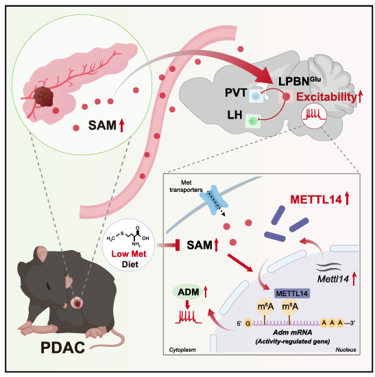 研究团队通过构建小鼠PDAC模型,结合多组学分析、神经示踪、光遗传及化学遗传学技术,发现外侧臂旁核谷氨酸能神经元(LPBNGlu)中甲基转移酶样14(methyltransferase-like 14,METTL14)显著上调,而且是驱动PDAC相关疼痛–抑郁共病的关键调控因子。METTL14通过协同肿瘤衍生的S-腺苷甲硫氨酸(S-adenosylmethionine,SAM),促进肾上腺髓质素(adrenomedullin,ADM)mRNA的N6-甲基腺苷(m6A)修饰,从而诱导神经元过度兴奋,增强LPBNGlu–室旁丘脑(PVTGlu)和外侧下丘脑(LHGlu)的环路投射,最终导致共病的发生。进一步研究发现,PDAC患者和模型小鼠的循环SAM水平均显著升高,并与临床疼痛及抑郁症状严重程度密切相关。通过蛋氨酸限制饮食降低体内SAM水平,可有效减轻神经元过度兴奋,缓解共病症状,并同时抑制肿瘤生长,获得镇痛-抗癌协同的效果(图)。