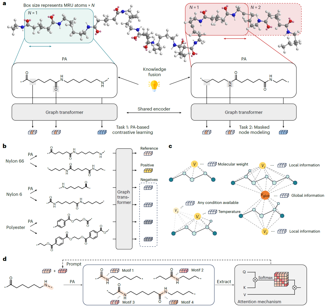 高分子材料由于结构复杂多样,具备高度可调的物理化学性质,被广泛应用于多个关键领域。结构的灵活性赋予材料极为广阔的性能设计空间,但也导致构效关系高度复杂,严重制约了理性设计效率。近年来,人工智能在小分子化合物、蛋白质等体系中取得重大进展,但在高分子领域的迁移应用仍面临结构难以表达、数据严重稀缺等挑战。针对上述难题,该研究构建了一种以自监督学习为核心的框架,提出以化学知识驱动的“周期性增强”策略作为结构先验。模型基于大规模无标签高分子结构数据进行预训练,通过对比学习,引导模型识别高分子重复单元的周期性模式,从而学习高分子通用的结构特征。同时,在微调阶段引入“周期性提示”机制,进一步提升对结构上下文的理解和泛化能力。此外,该研究还提出了一种模块化的图构建策略(PolymerGraphs),通过引入虚拟节点灵活融合全局与局部条件信息,实现对不同类型共聚物体系的适应性建模。