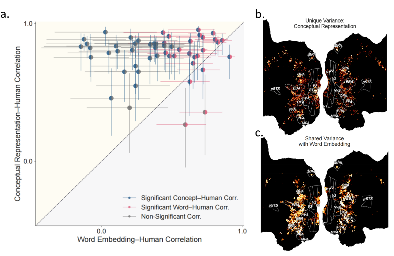 仅依赖下一个token预测训练的大语言模型(LLMs)是否形成了类似于人类的概念是人工智能与认知科学共同关注的科学问题。研究团队将“反向词典”任务重构为概念探针,结合表征相似性分析(RSA)等计算方法,系统探究了LLMs在不同语境下构建概念表征的能力。研究团队提出的模型能够根据语言描述灵活推导概念,且其表征逐渐收敛于一种共享的、独立于具体语境的关系结构。这些关系结构不仅能可靠预测模型在各项理解与推理任务中的表现,还与SimLex-999、THINGS等人类心理行为数据高度一致。研究发现该表征与人脑视觉皮层等区域的神经活动模式呈现显著的对齐关系,这一发现验证了表征模型与组织结构的生物学合理性。