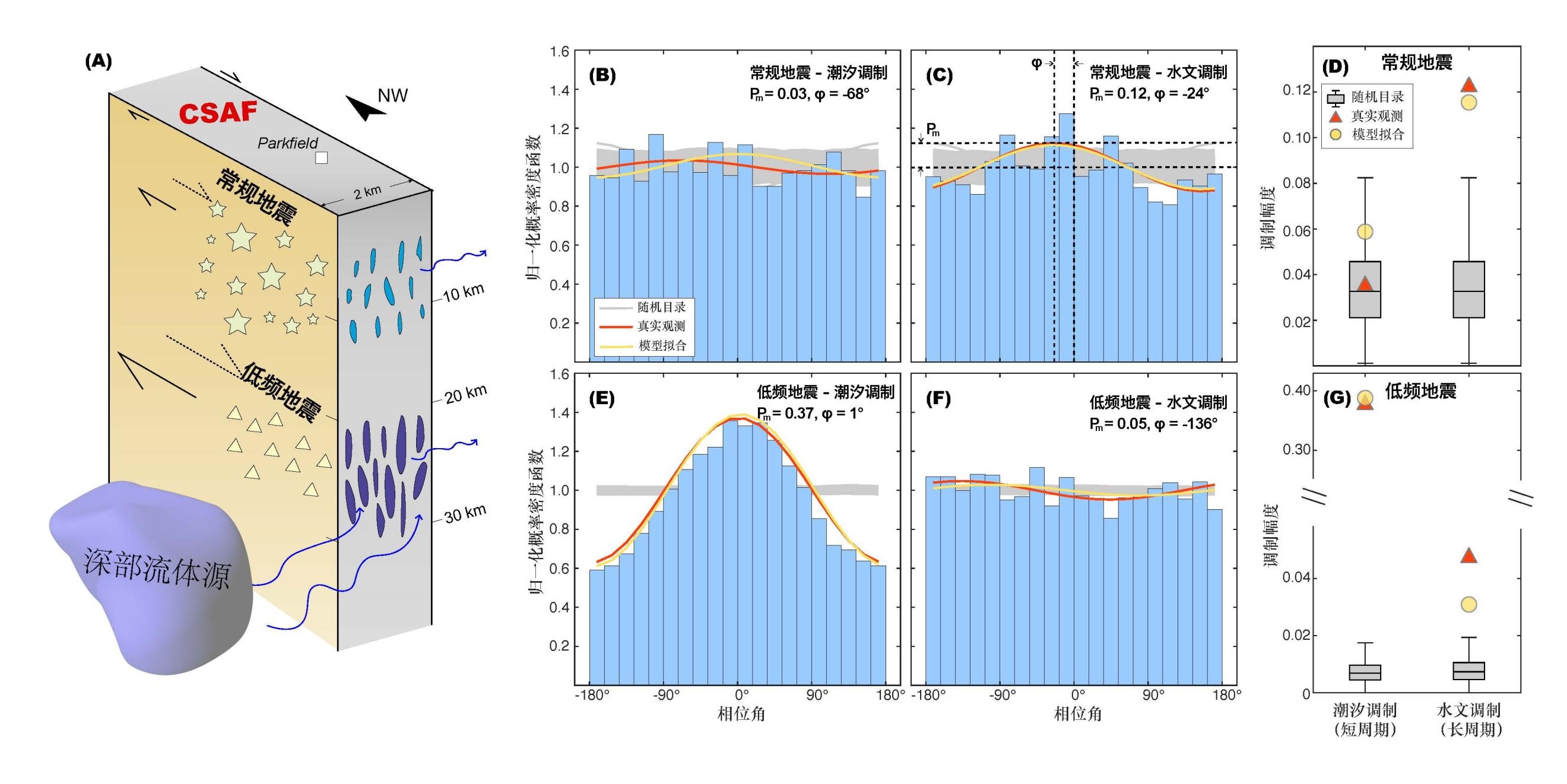 研究团队深入分析了美国圣安德烈斯断层中段常规地震和低频地震活动性对潮汐和水文调制的响应,其中常规地震发生在较浅深度(<10 km),低频地震发生在较深深度(15~30 km),发现常规地震更容易受到水文加载(年周期)的调制,而低频地震更容易受到潮汐加载(日周期)的调制(图)。为深入探索这一现象的物理机制,团队提出了结合孔隙流体扩散与地震非瞬态失稳过程的物理模型,并在此基础上定量约束了常规地震和低频地震的模型参数,揭示了孔隙流体在孕震过程中的重要作用。研究表明流体扩散很好地解释常规地震和低频地震在潮汐调制和水文调制上的差异,并且流体含量在深度上的分布是控制断层滑动模式在深度上转变的重要因素。