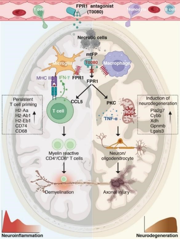 该研究进一步完善了CNS炎症与神经退行机制的理论体系,筛选并验证了FPR1拮抗剂T0080可作为治疗MS的潜在药物,为神经退行性疾病的治疗提供了新的思路和策略。