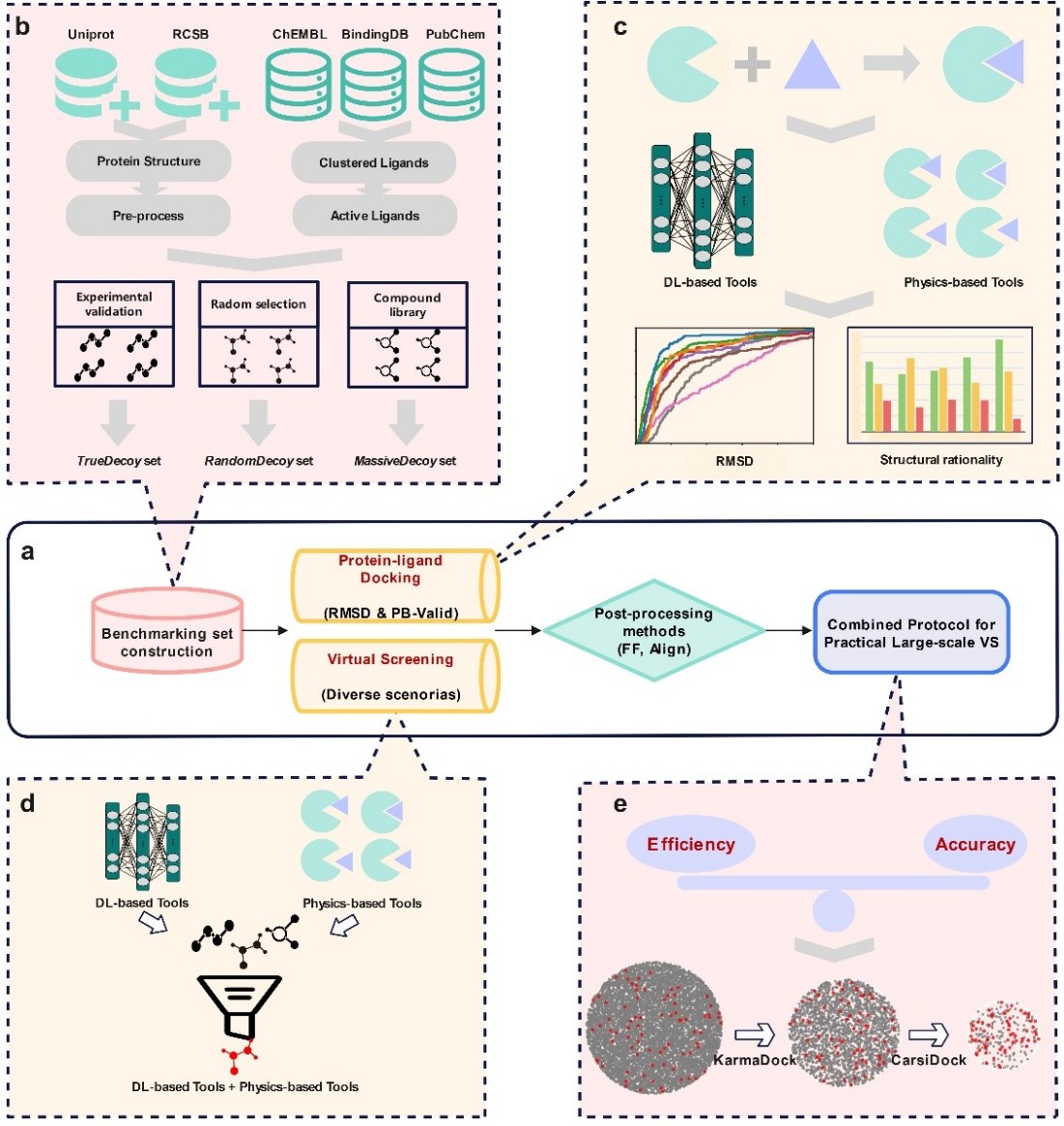 基于分子对接的虚拟筛选(VS)能高效识别和优化与特定靶点结合的先导化合物,从而显著降低早期研发成本与风险。传统基于物理原理的对接方法需要通过搜索算法探索配体的可能构象,并用打分函数来评估这些构象。这些方法为了提升虚拟筛选时的效率,对搜索算法和打分函数进行了简化,这限制了其在实际应用中的精度。近年来,随着数据科学的快速发展,基于AI的对接和打分新方法不断涌现,在对接的精度和速度方面展现了巨大的潜力。但是这些工具往往会忽略对接构象的物理合理性,其在实际VS中的应用潜力尚未得到充分验证,且其性能对训练数据的依赖性也亟待系统评估。