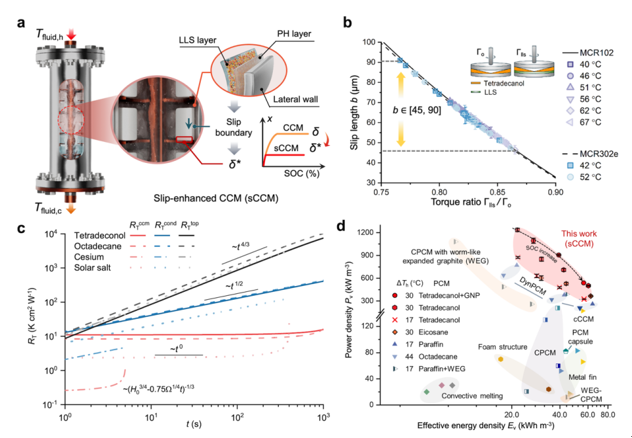 图 (a) 基于滑移强化接触熔化的快充相变储热装置设计,(b) 液体相变材料在类液表面上的滑移长度表征,(c) 基于理论分析模型的热阻分析,(d) 相变储热装置功率密度以及能量密度对比